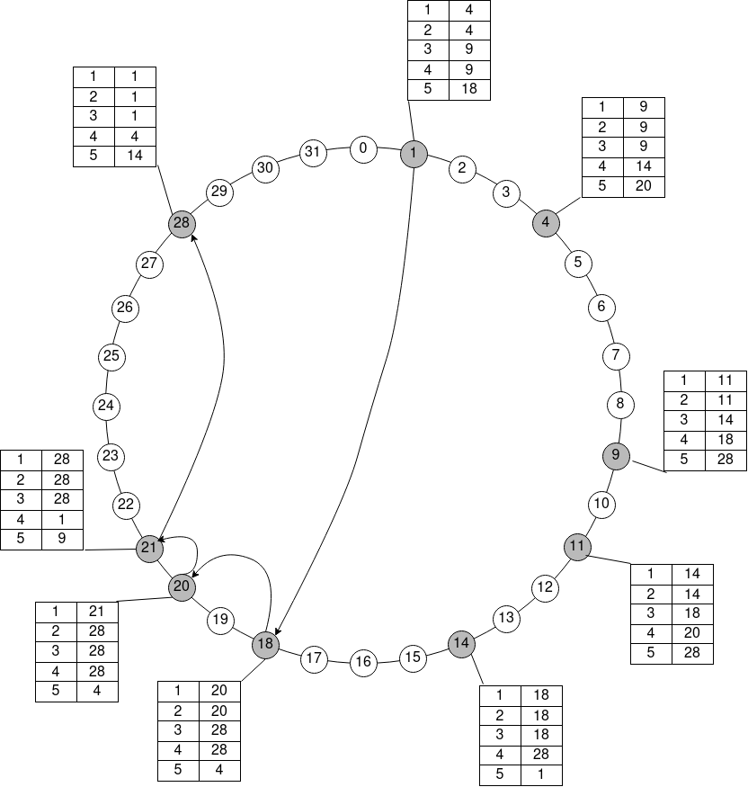 Die Tabelle neben dem Ring ist die Finger-Tabelle, die eine logarithmische Zugriffszeit auf alle Nodes sicherstellt.