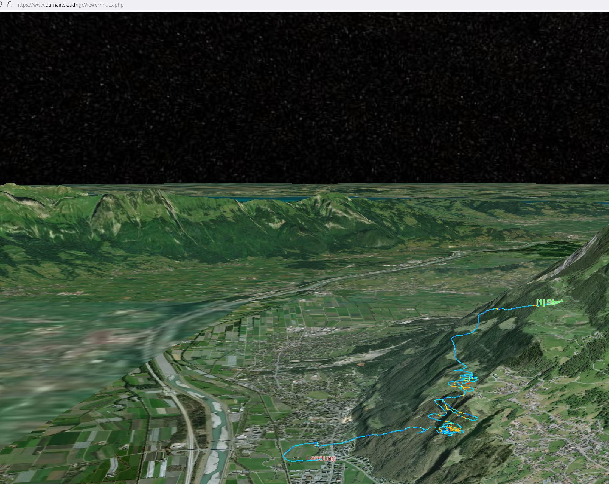 Auf https://www.burnair.cloud/igcViewer/index.php können Flüge in 3D analysiert werden. Das sieht dann beispielsweise so aus: